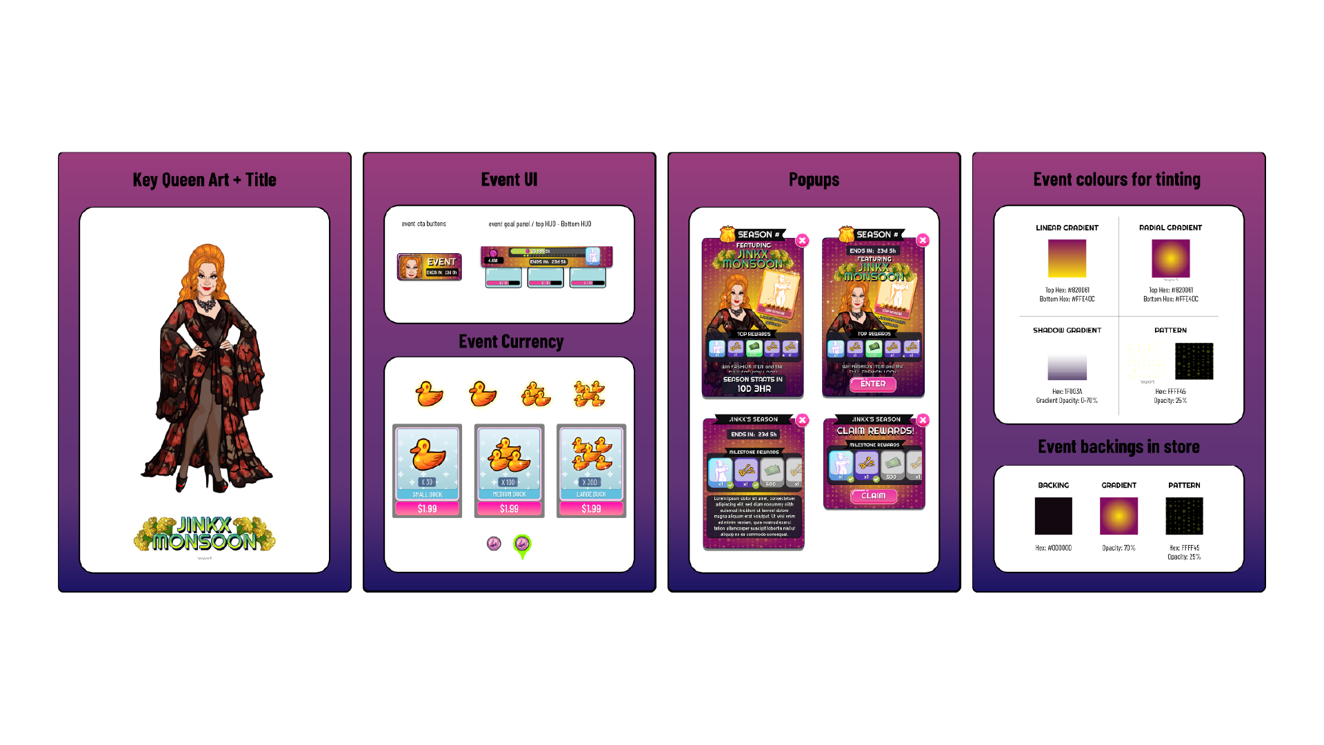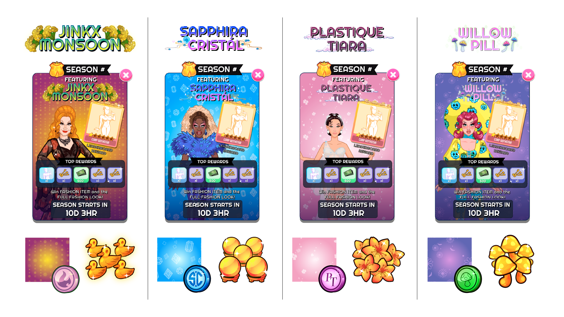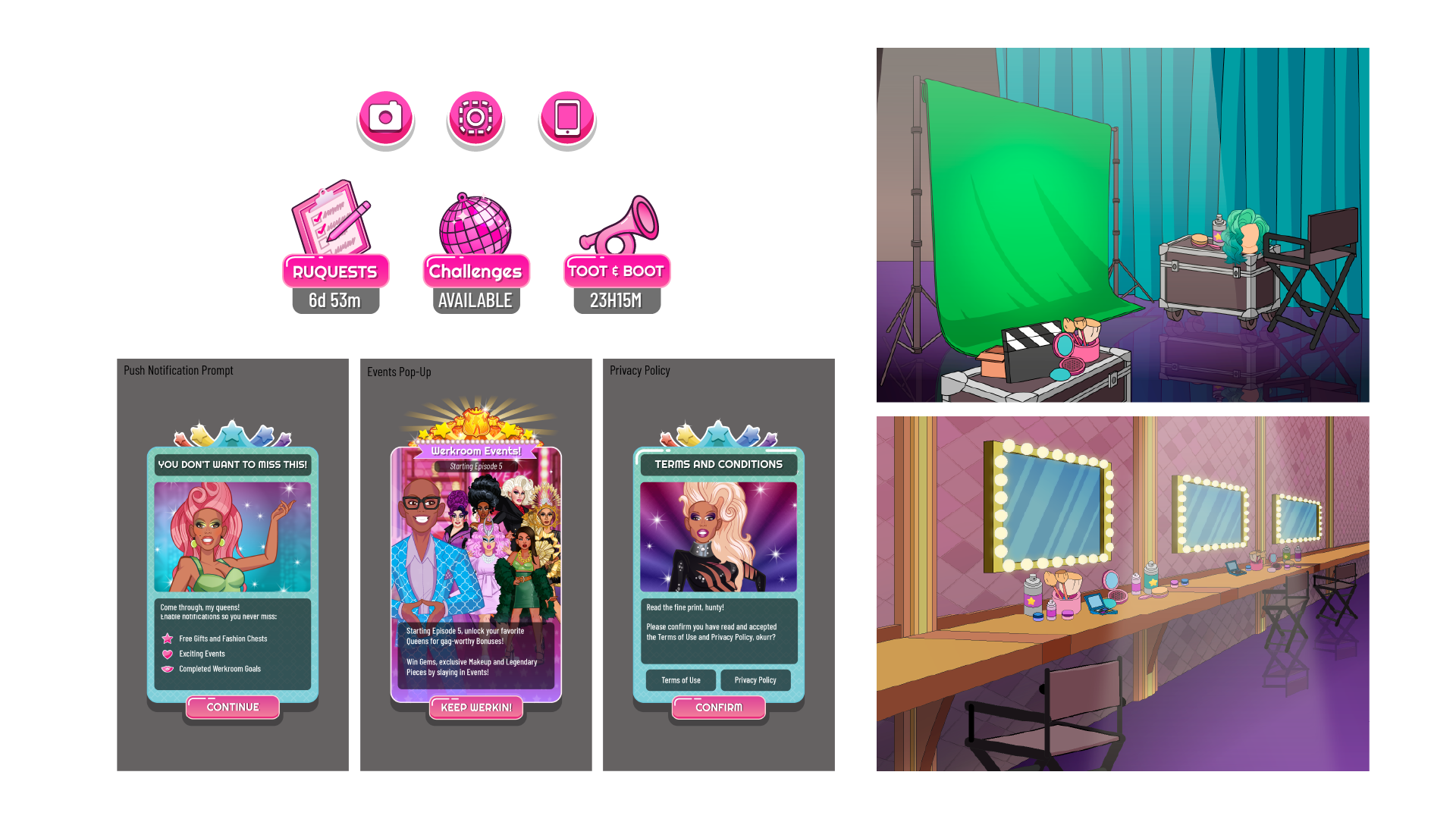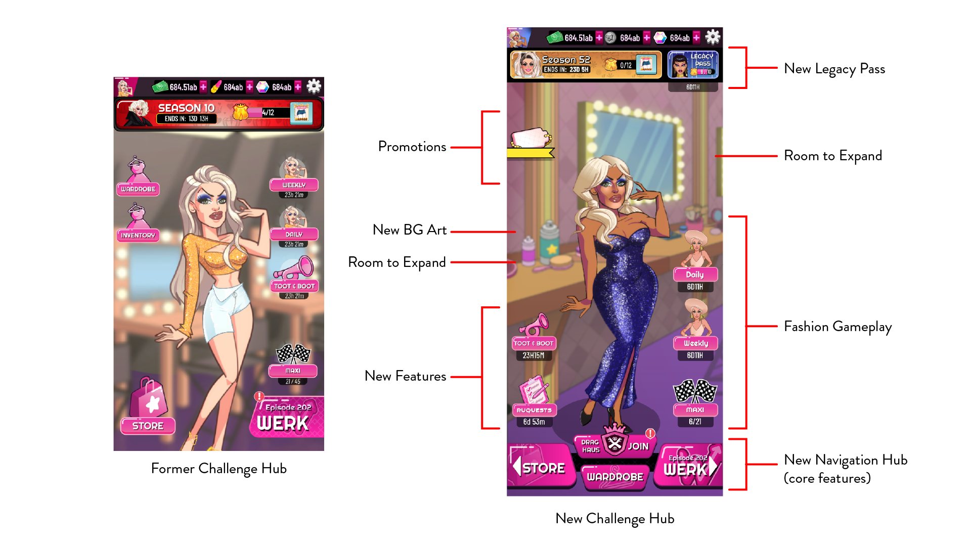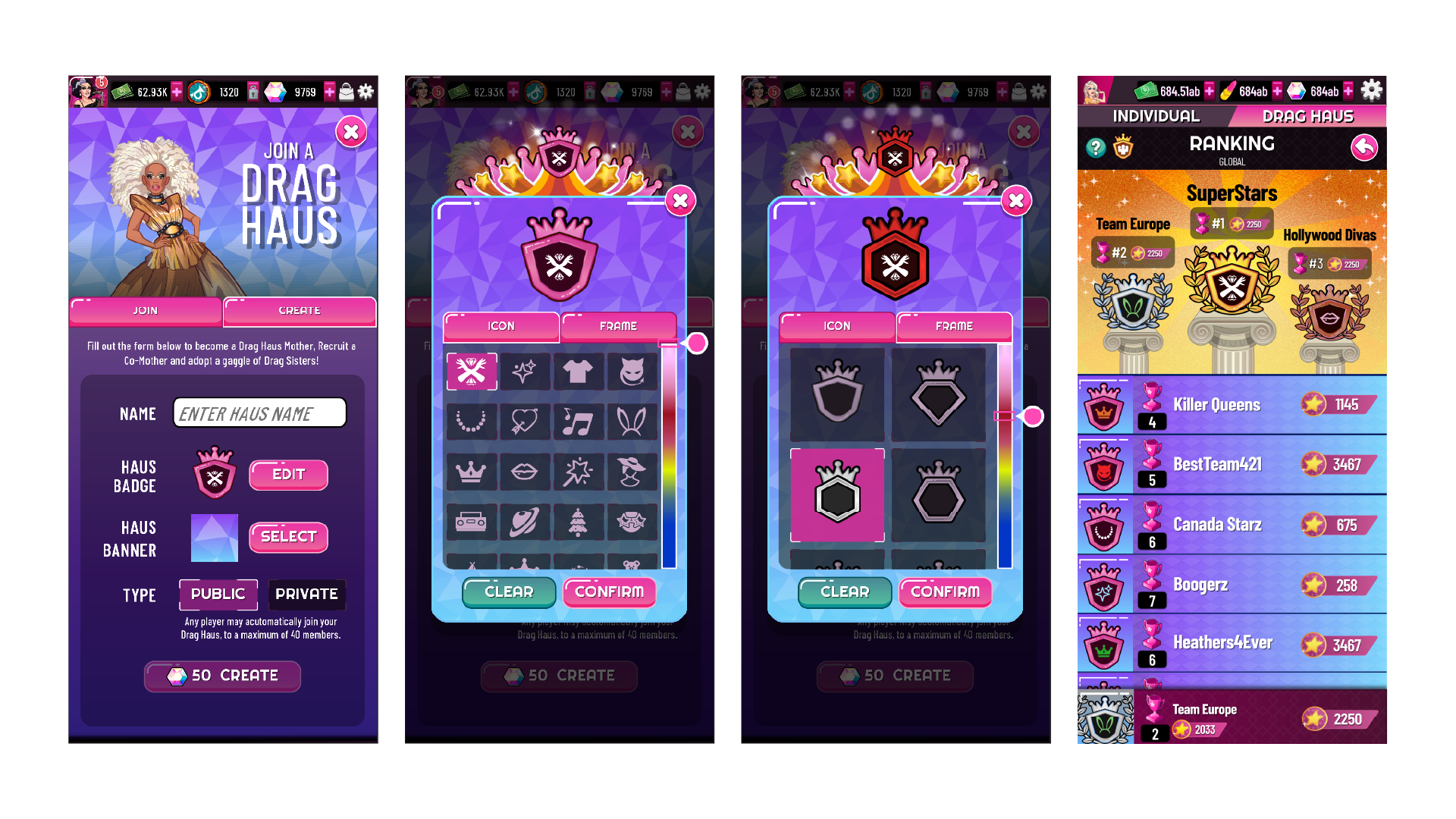 ⭐ Lead Artist: Led the UI/UX development process for new features including a Drag Haus (Team Guild), Challenge Hub (Event Screen), promotion mechanics and other art as needed.